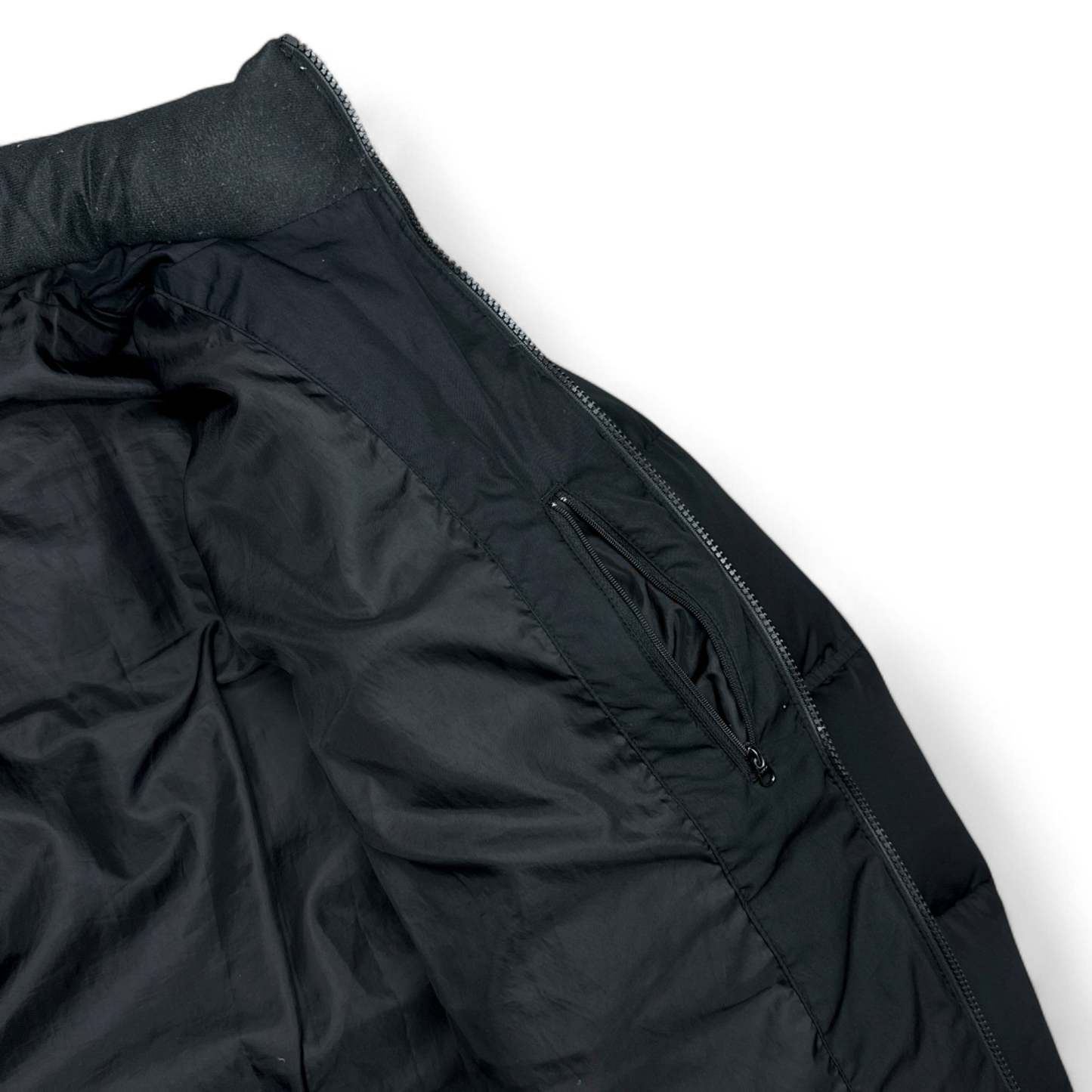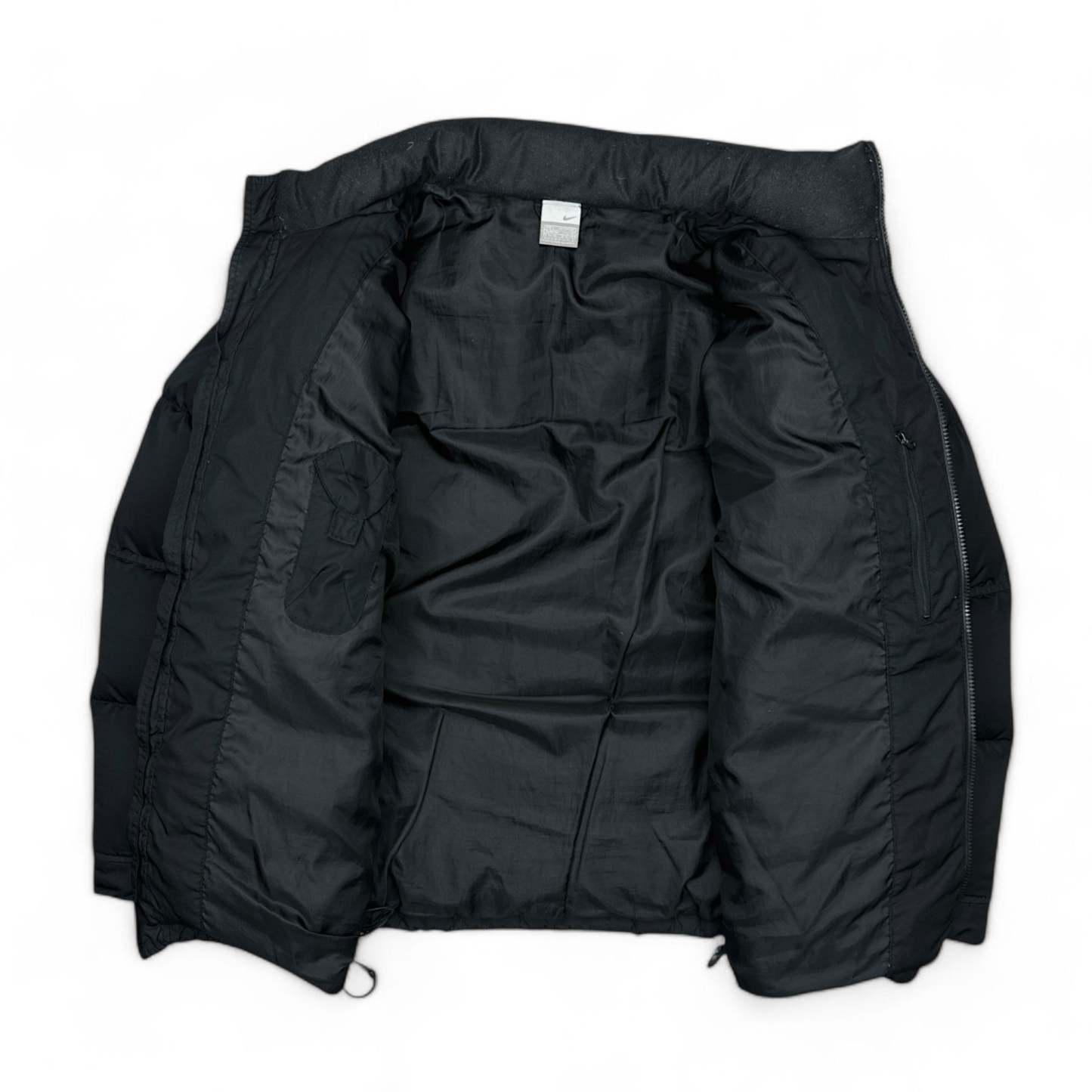 Authentische schwarze Nike Pufferjacke aus den fr��hen 2000ern mit klassischem Stepp-Look und dezentem Logo auf der Brust. Der verstaubare Kapuzenkragen sowie die verstellbaren Kordelz��ge an Kapuze und Saum bieten praktischen Komfort und machen die Jacke zum perfekten Begleiter f��r kalte Tage und Streetwear-Outfits.